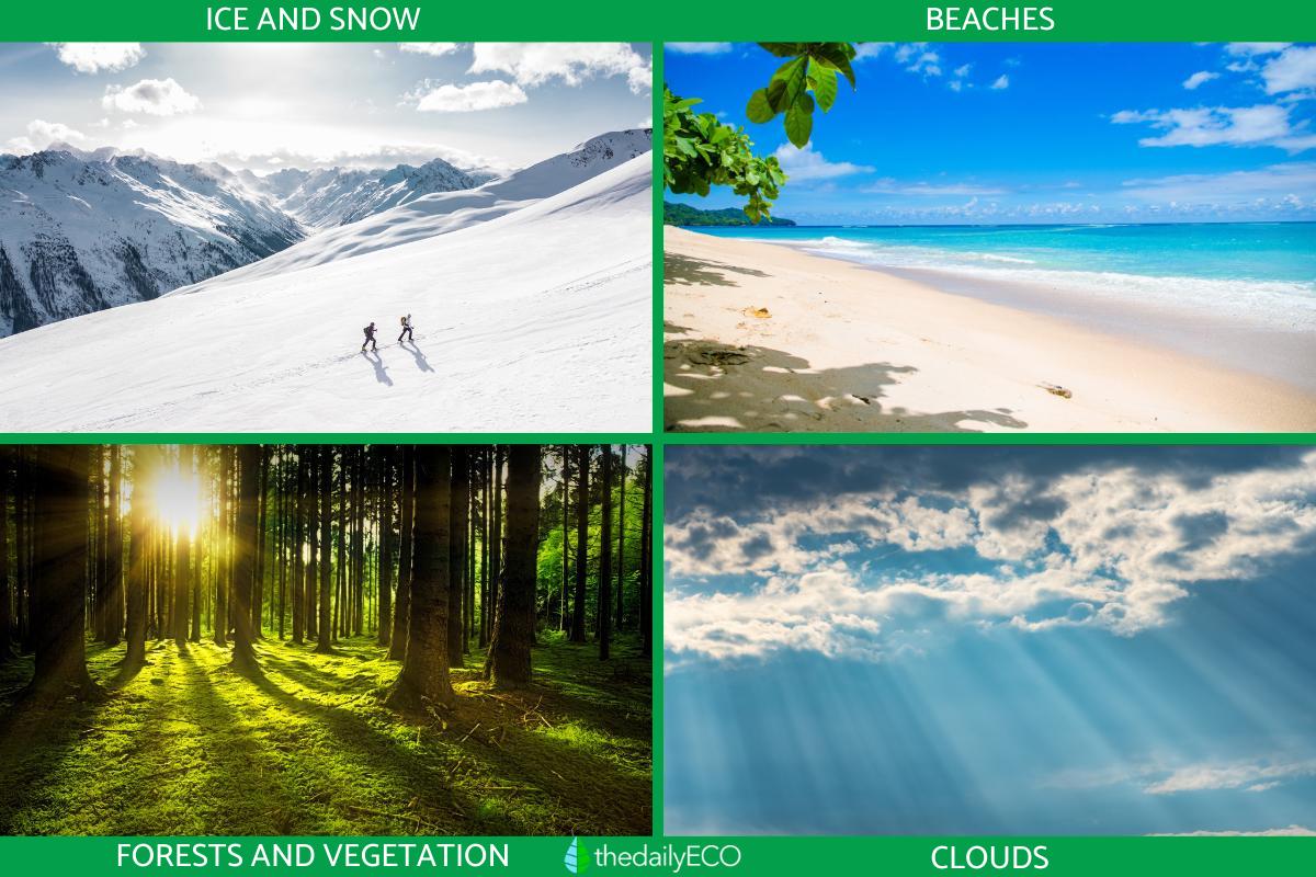 - Beaches and sand: although not as reflective as snow, they still reflect a significant amount of solar radiation, helping to maintain cooler temperatures in coastal areas.