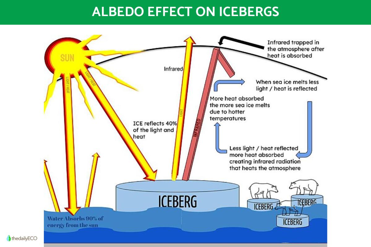 Different surfaces alter the albedo effect. We can see how the albedo effect works on icebergs in the diagram below.