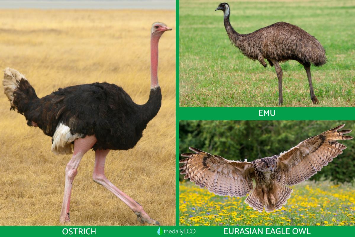 - Ostrich (Struthio camelus): is the largest and heaviest bird in the world. It is considered dangerous due to the great strength of its legs. Like the cassowary, they are equipped with powerful claws capable of causing serious injuries or even killing a potential predator if threatened.