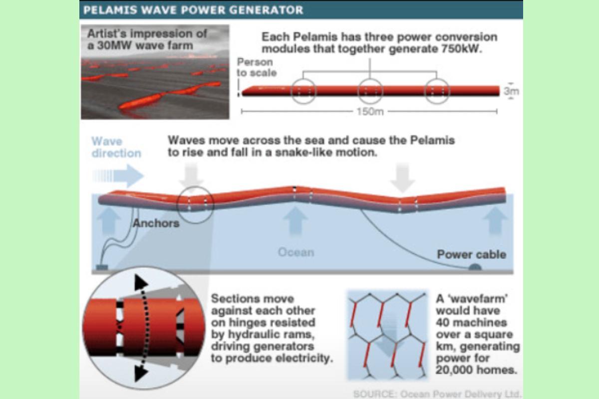 The Pelamis system is made up of several connected segments that resemble a floating snake. As they move with the waves, the segments flex and compress hydraulic generators located at the joints, generating electricity. It is no longer in use and has been decommissioned.